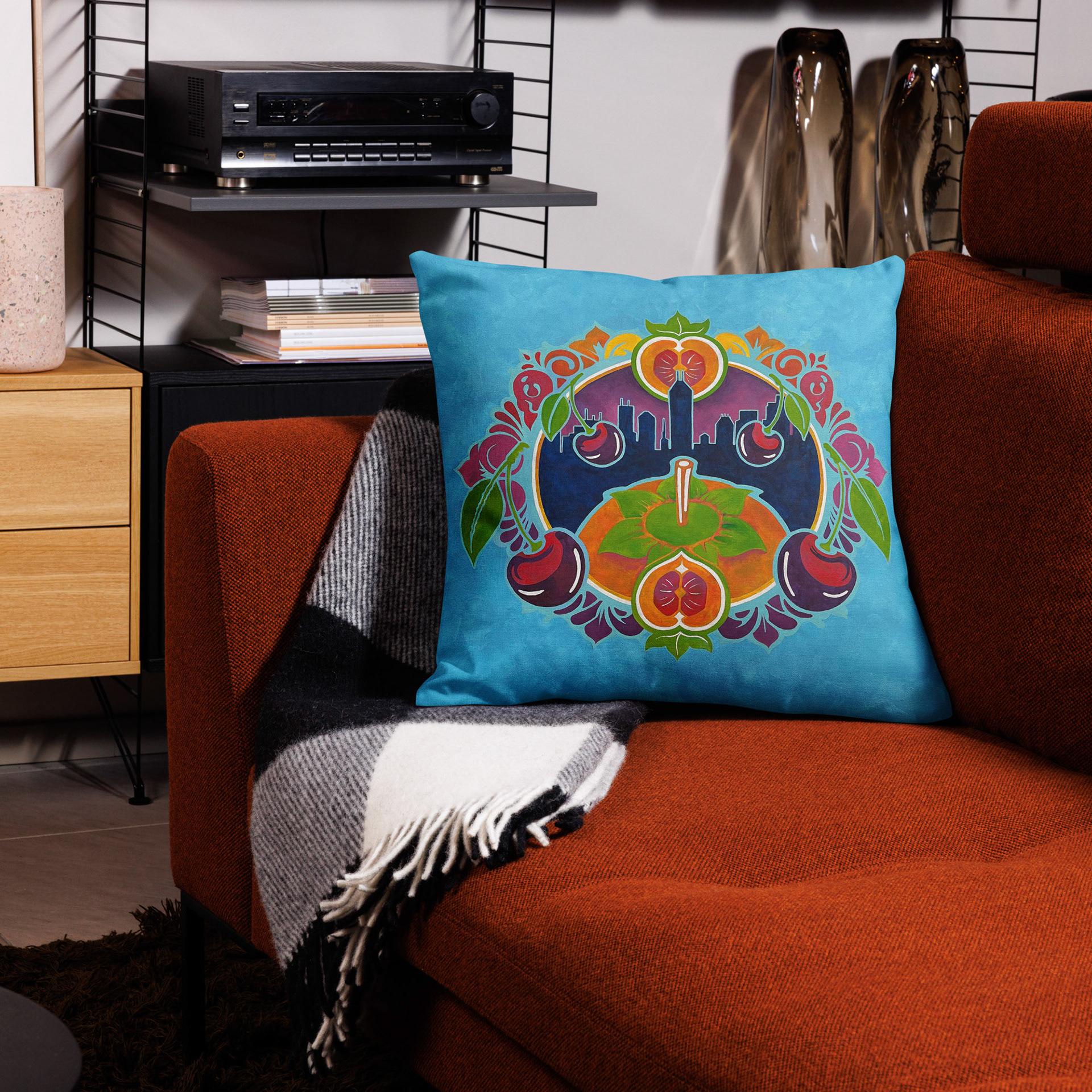 "Fertile Land II" is a fruity, juicy pattern composed of persimmon & cherry surrounding the Indianapolis skyline in vibrant acrylics on stretched canvas.